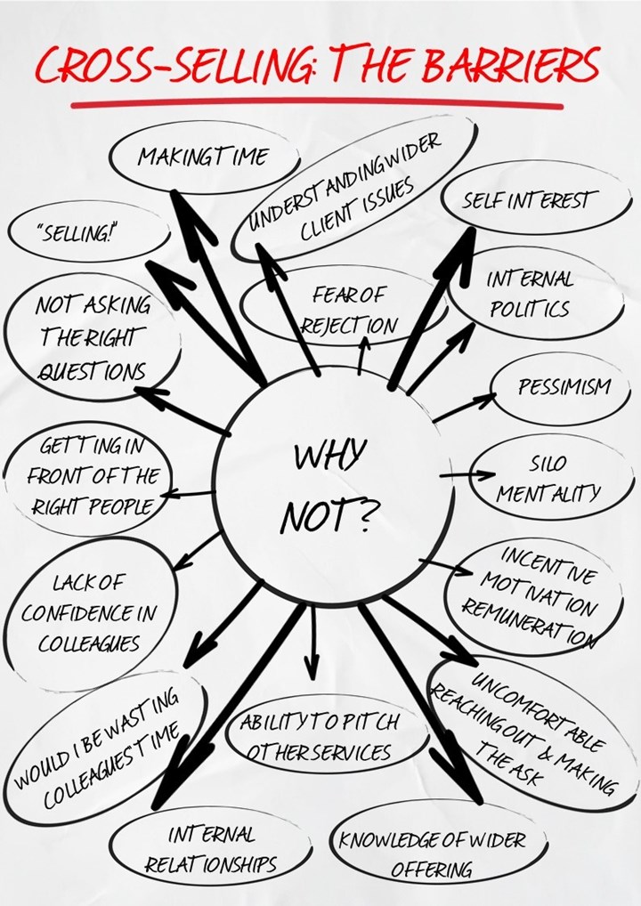 So perhaps you need to get some of your partners together in a big room (suitably socially distanced of course) with a lot of coffee and cake, stick a print of the accompanying flipchart on the wall and have a very challenging but necessary debate about which of the common cross-selling barriers are holding your firm back. And what are you going to do about this.